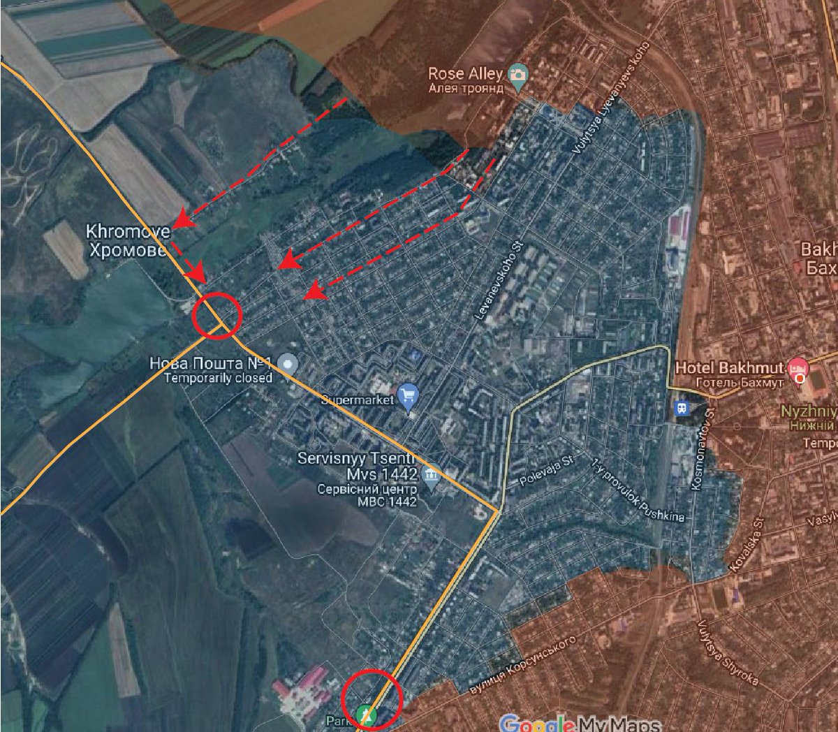 The remaining Ukrainian forces in Bakhmut are supplied across a dirt road from Ivaniske. At this point, no high rise blocks or strongpoints remain in Wagner's path to this crucial last supply line - only detached homes.