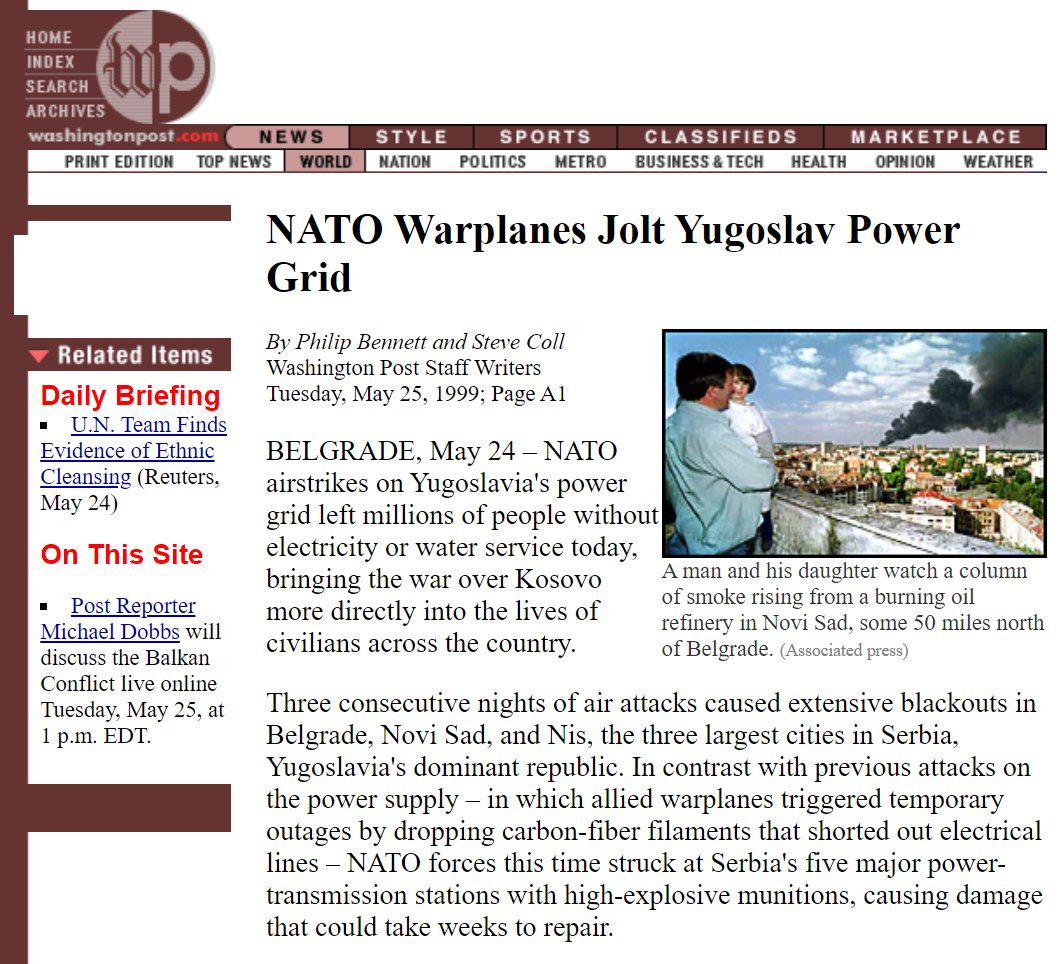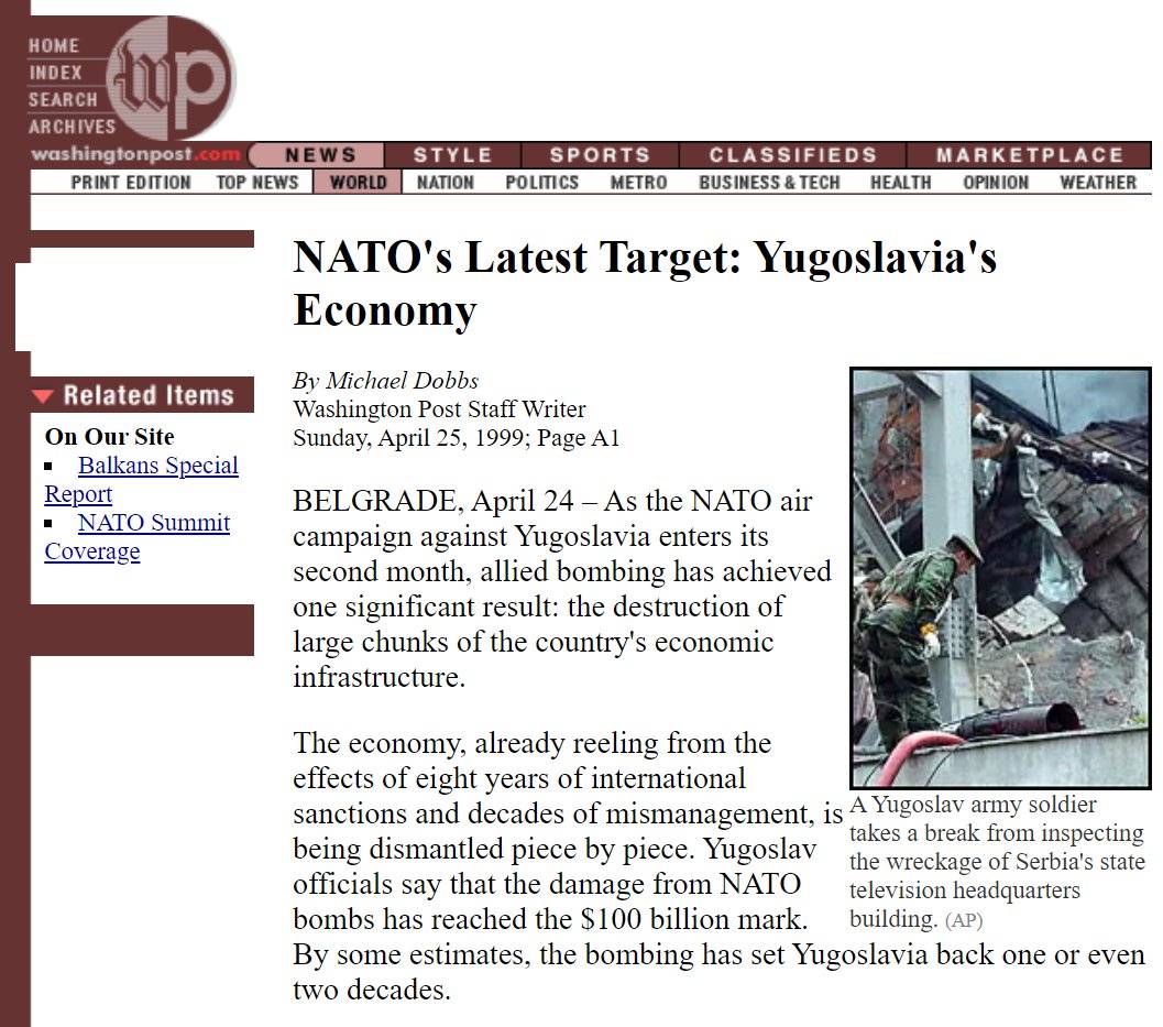 🧵THREAD: On March 24, 1999, NATO began illegally bombing Yugoslavia for 78 days without the approval of the United Nations, dropping more than 28,000 bombs, including depleted uranium and cluster munitions, killing over 2000 civilians and displacing more than 250,000 people. ImageImageImageImage