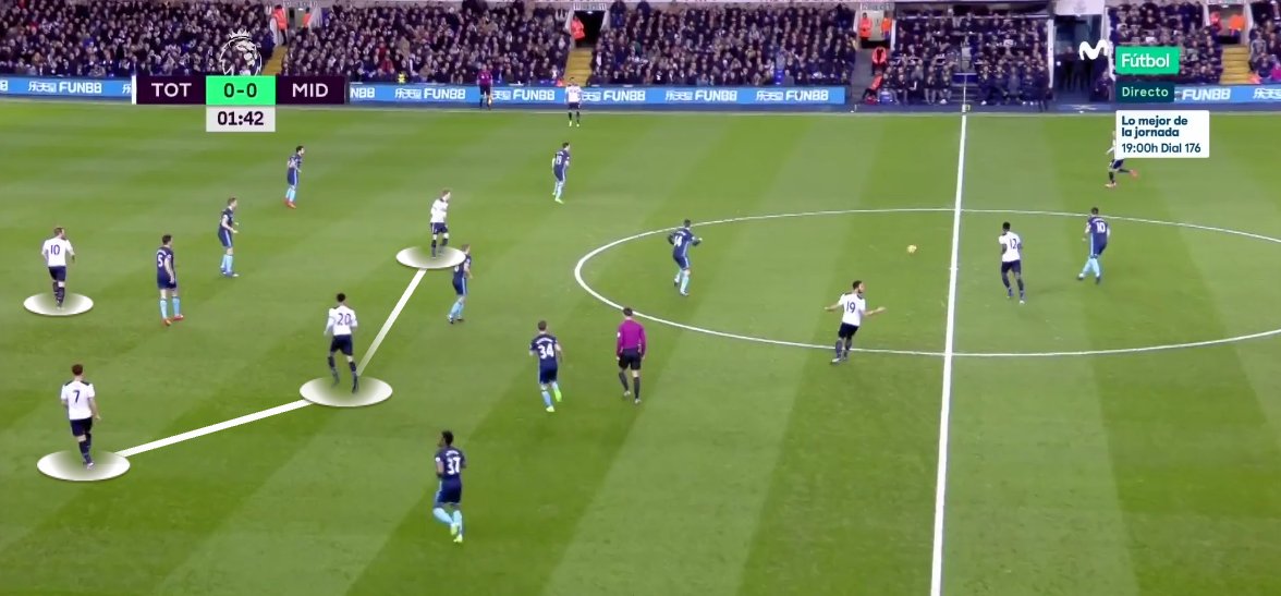 In attack, the high and wide positioning of the fullbacks forced Heung-min Son, Dele Alli, Christian Eriksen, and Harry Kane to tuck inside and operate within close proximity in the final third.