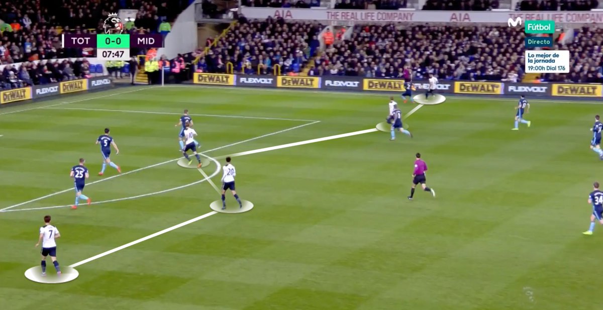 Spurs often struggled to play out from the back within that structure, though, and it was largely because their centre backs who split either side of Lloris had to operate in large spaces with uncomfortability ahead of them in the double #6 (both Wanyama/Alderweireld struggled).