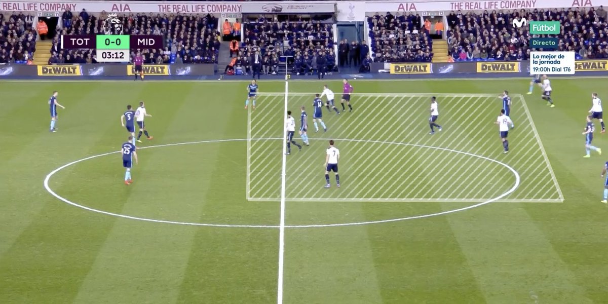 Once play was progressed from outside their own half, Spurs' fullback would position themselves high & wide on each flank (Davies out of shot below).