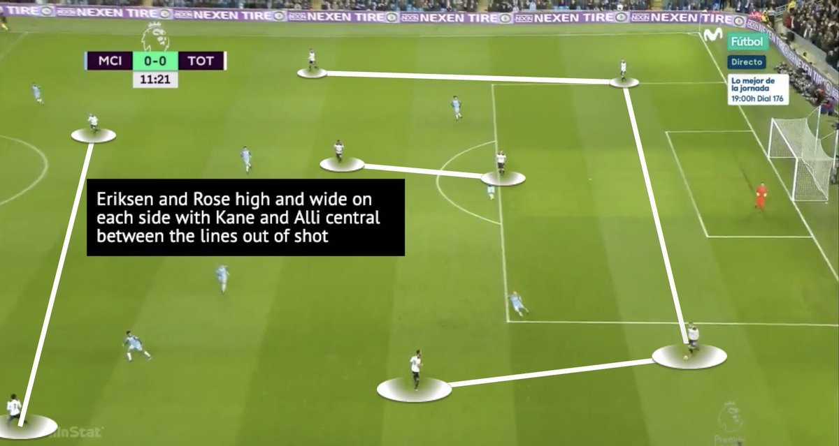 Spurs started off in the very first phase in a 4-2-4 shape with the outside centre backs splitting either side of Lloris, Alderweireld stepping high alongside Wanyama in the double #6, both fullbacks positions themselves high & wide, & Eriksen + Dembéle come into each half space.