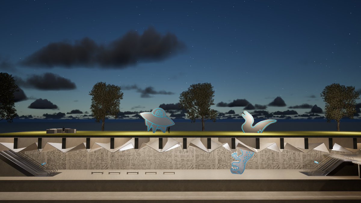 Takhle pojatou minimalistickou výzdobu ještě rozruší obří socha dinosaura. Jeho tělo se totiž jakoby boří hlavou vzhůru skrz strop stanice. Horní polovinu dinosaura tak uvidíte v podzemí, jeho nohy s ocasem zase na náměstí na povrchu (ještě s létacím talířem).