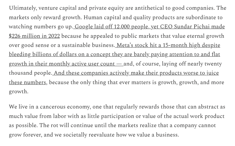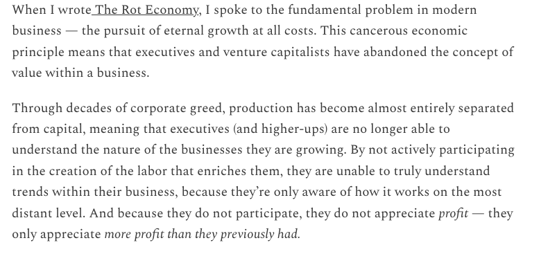 The problem of everything I've been writing about is the pursuit of eternal revenue growth - the quality of a product is now subordinate to shareholder value, meaning that the people at the helm in the media are fully disconnected from production itself. ez.substack.com/p/absentee-cap…