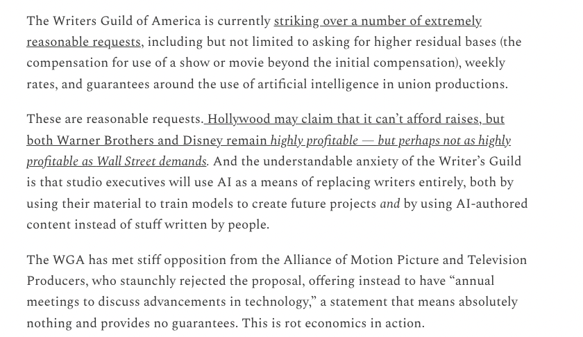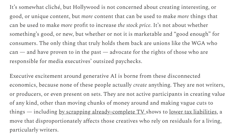 The WGA is on strike, fighting the AMPTP for both fairer pay structures for creatives and definitive protections against AI-generated content. Media executives love AI because they don't see media as creative - they just want *more of it to sell*. ez.substack.com/p/absentee-cap…