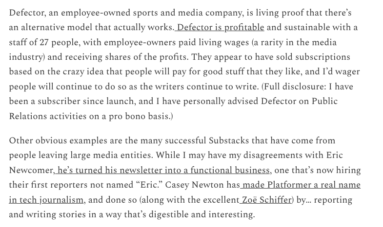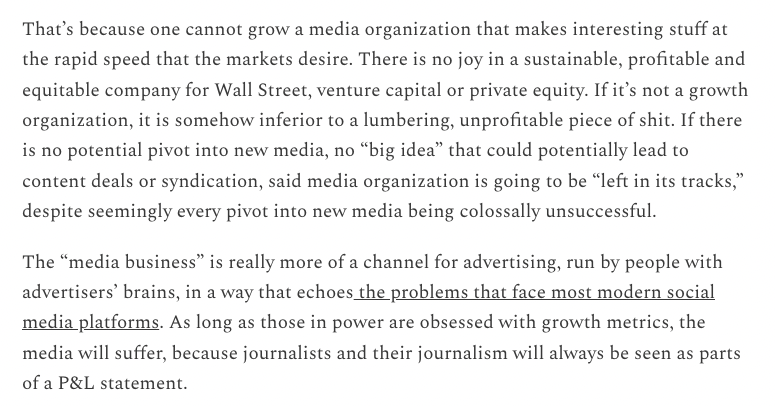 Media orgs can be profitable if they're built sustainably. Defector is profitable. Platformer is profitable. Newcomer is profitable. All because they sell good content and built sustainable businesses while actually understanding the content itself. ez.substack.com/p/absentee-cap…