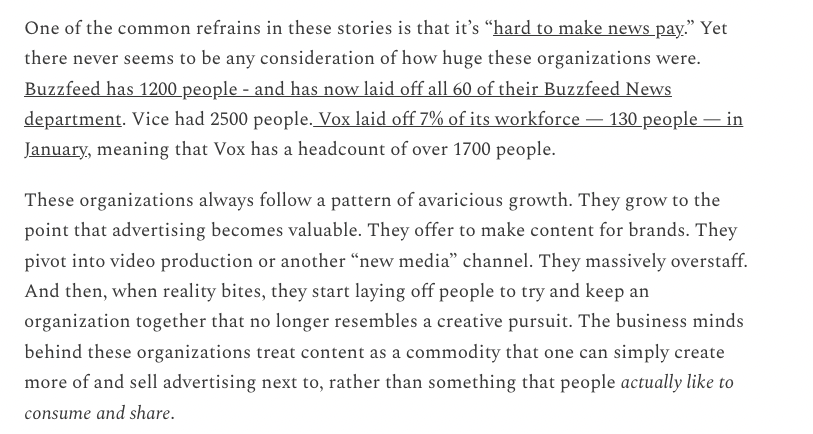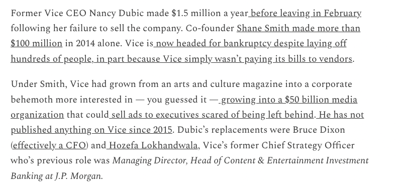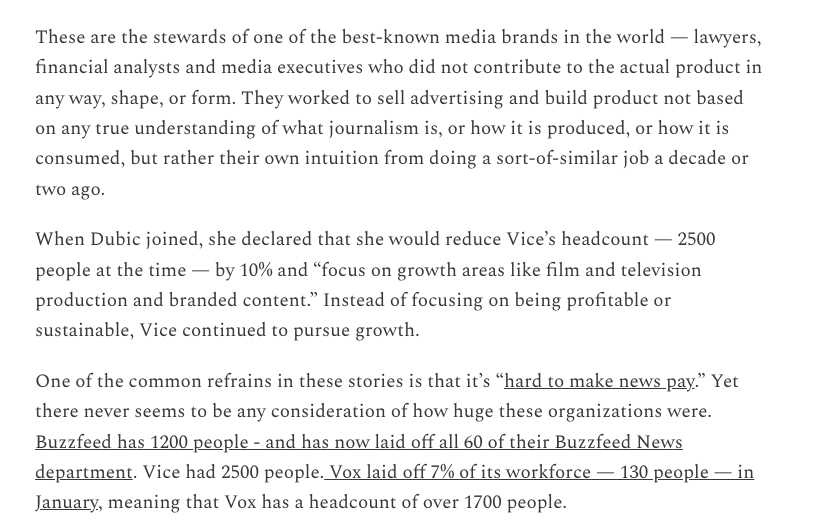 Vice was run into the ground by executives that wanted to sell ads over making a sustainable news outlet. They overstaffed and pushed recklessly into random, unprofitable markets, because they are not creators - they're private equitors by another name. ez.substack.com/p/absentee-cap…