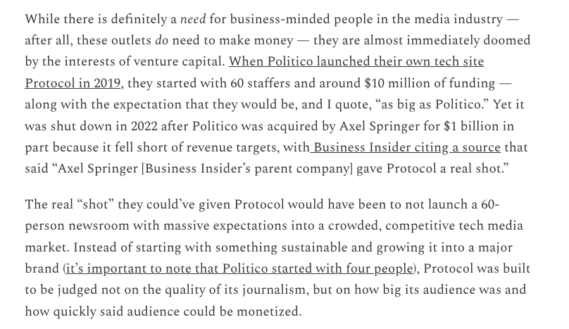 Politico (and Axel Springer) never gave Protocol a chance, because they set it up for failure by massively overstaffing the publication and immediately giving it multi-million dollar targets in a crowded tech media market. It's a victim of rot capitalism. ez.substack.com/p/absentee-cap…