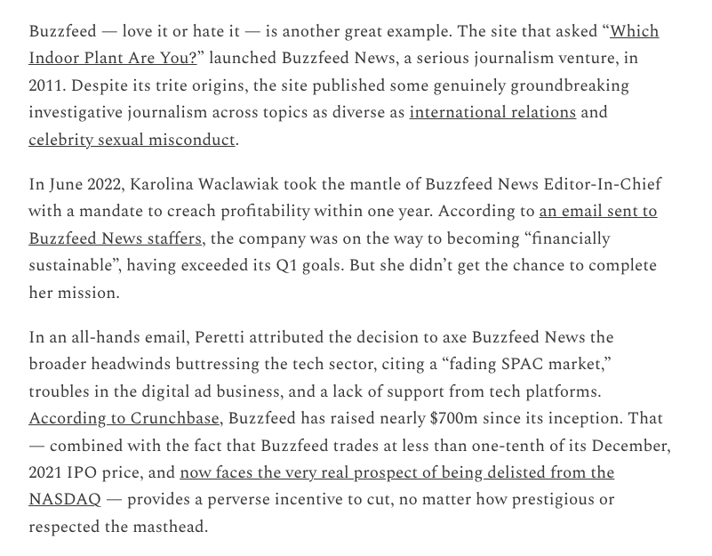 Buzzfeed had, at one point, one of the best newsrooms in the world. They killed it because Jonah Peretti never tried to run Buzzfeed - let alone Buzzfeed News - as a sustainable enterprise, instead chasing eternal growth and a doomed SPAC IPO. Scummy. ez.substack.com/p/absentee-cap…