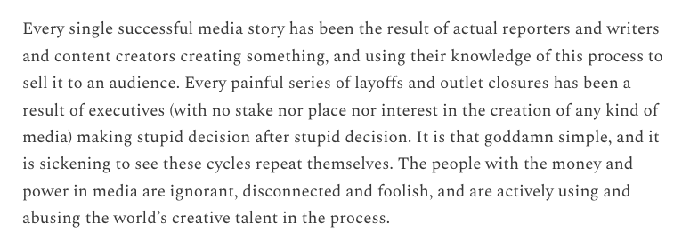 Every successful media story has been the result of reporters and writers and content creators creating something, and using their knowledge of this process to sell it to an audience. Every failure is a result of executive interference and ignorance. ez.substack.com/p/absentee-cap…