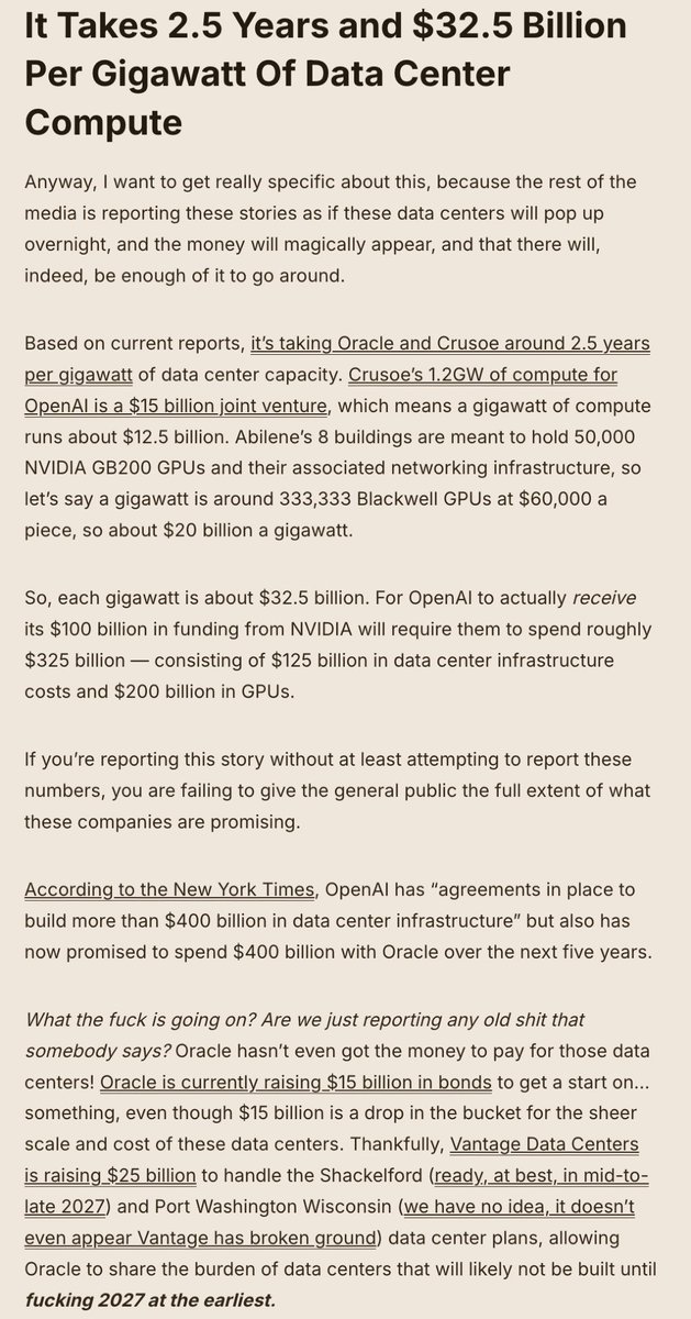 Between NVIDIA and Oracle, OpenAI has now committed to 17 gigawatts of AI data center capacity, and to be clear, it takes about 2.5 gigawatts and more than $32.5 billion per gigawatt. There is no way these data centers actually get completed before 2028. wheresyoured.at/openai-onetril…