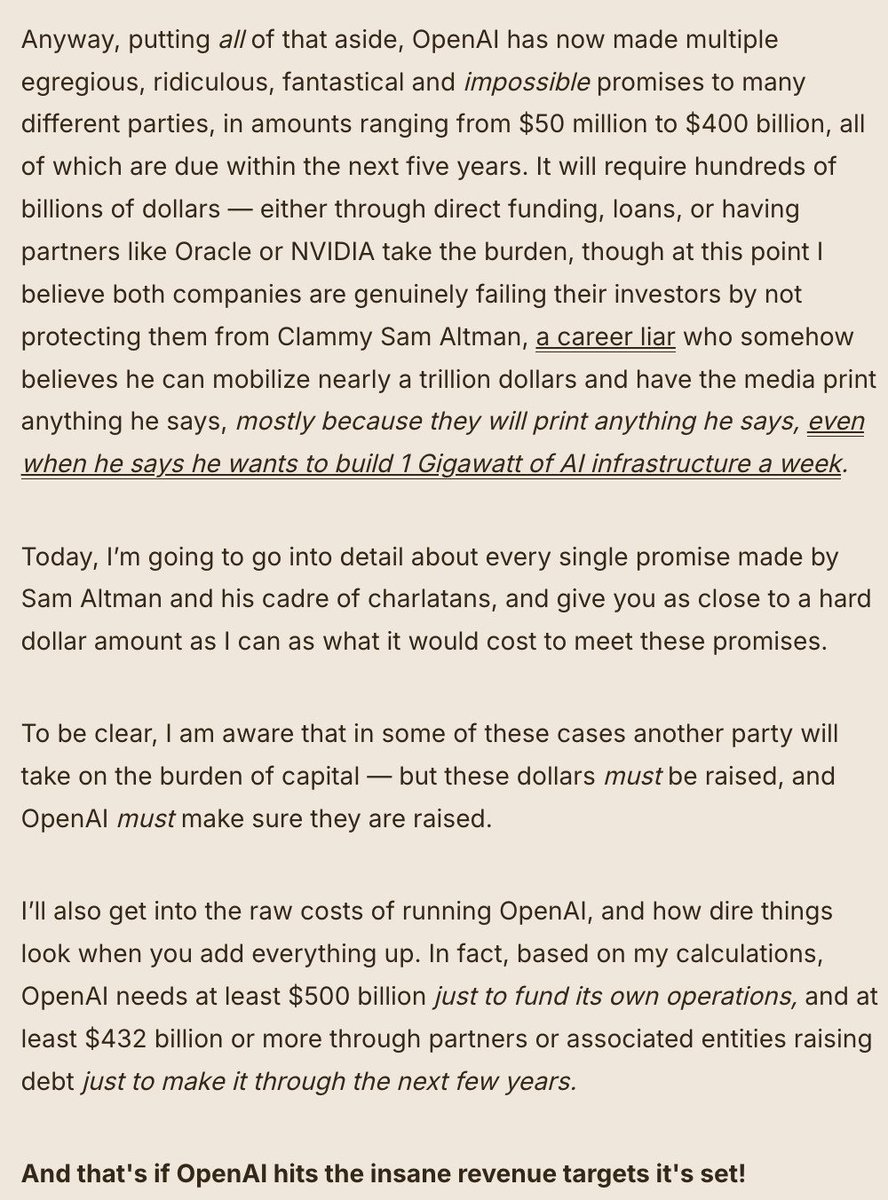 I spoke with analyst Gil Luria at D.A. Davidson, asking if the capital existed to build OpenAI's promised 17GW of data centers: "Of course there isn't enough capital for all of this," but "enough capital to do this for a at least a little while longer."