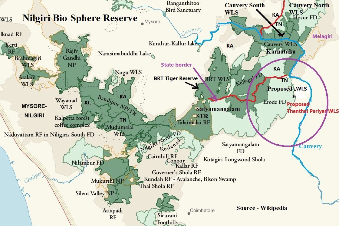 Cauvery basin has only 16636 sqkm of forest, but they are one of the most eco-diverse forest in the world with many endemic species. They hold 8 national parks, UNESCO bio-sphere reserve, 24 wildlife sanctuaries, 6 Tiger reserves, 8 Bird Sanctuaries, Ramsar sites, Mangroves 2/3