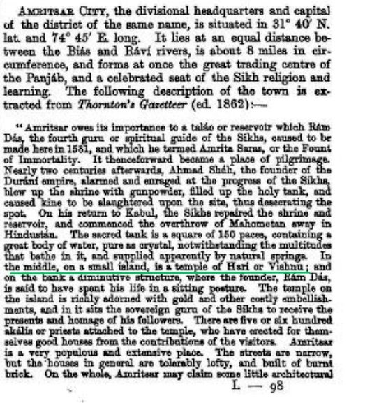 This is how Thornton's Gazetteer (ed. 1862) mentions Amritsar's holiest temple, Harmandir Sahib