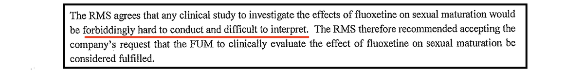 The UK’s @MHRAgovuk accepted that “any clinical study to investigate the effects of fluoxetine on sexual maturation would be forbiddingly hard to conduct and difficult to interpret.”