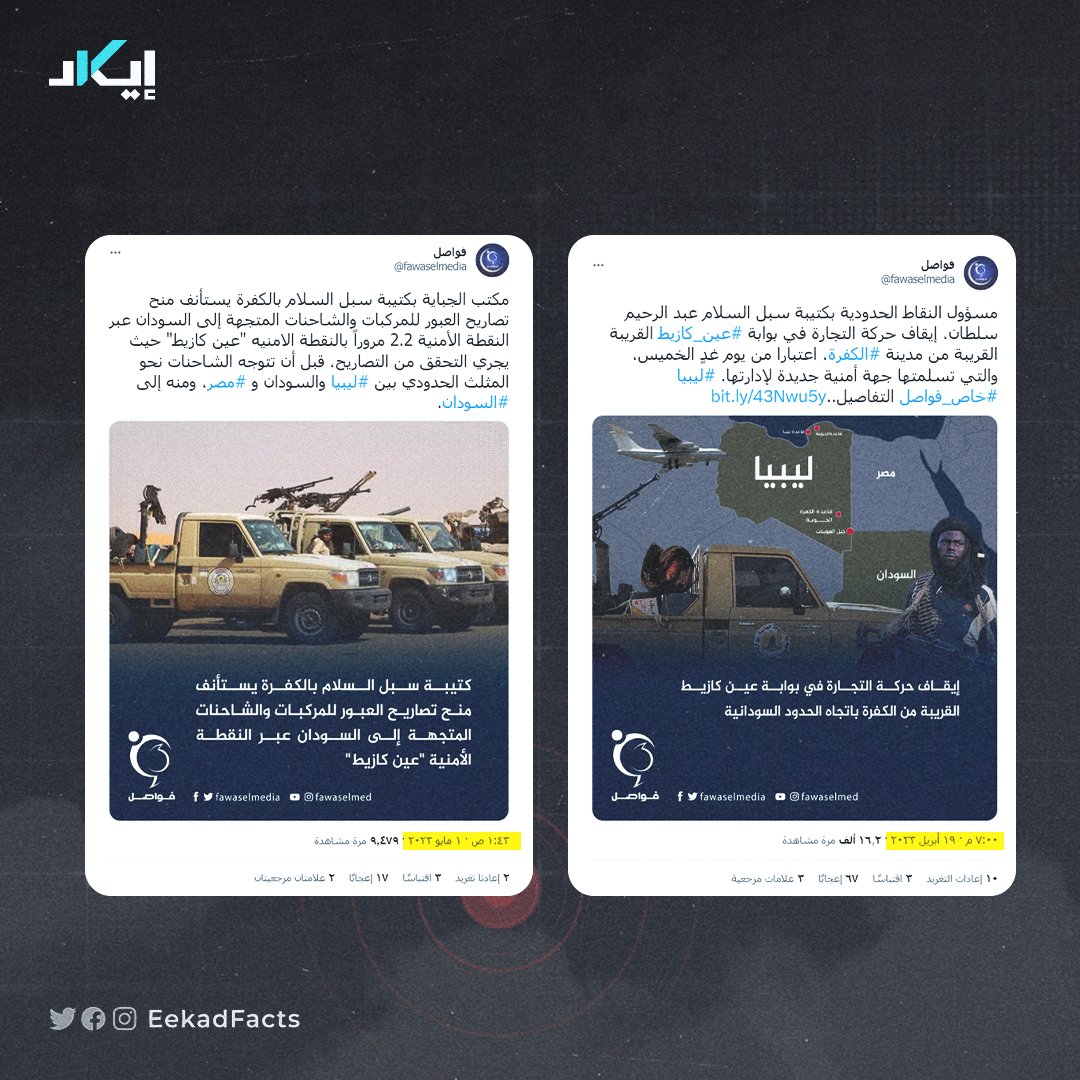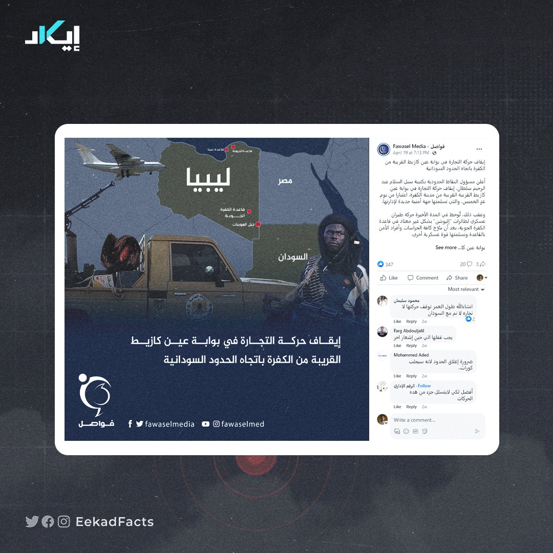 🔻 ما كان مثيرًا للشكوك بالنسبة لإيكاد هو ما كشفته تقارير ليبية، في 19 أبريل، عن توقف الحركة التجارية في بوابة عين كازيط القريبة من مدينة الكفرة الليبية، وهي الفترة التي تزامنت مع الأخبار عن توريد الأسلحة من ليبيا إلى السودان، لتعود الحركة في البوابة في 1 مايو.