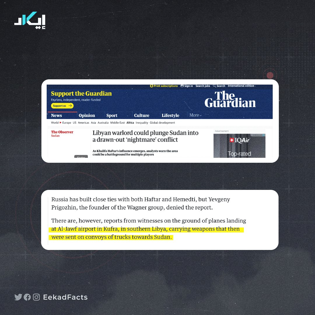 🔻 أيضًا الغارديان البريطانية نقلت عن شهود عيان أن طائرات محملة بالأسلحة هبطت في مطار الجوف في الكفرة جنوبي ليبيا، وهي مناطق تقع تحت سيطرة حفتر، ثم تم إفراغ شحنتها وإرسالها في قوافل باتجاه السودان.