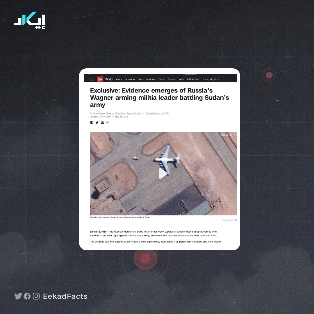 🔻 أما موقع CNN الأمريكي فقد كشف في 20 أبريل، من خلال مصادر حصرية وبيانات ملاحية، عن تقديم فاغنر الروسية إمدادات عسكرية إلى "حميدتي" من قواعدها في سوريا، وقواعد نشطت بها فاغنر في ليبيا سابقًا.