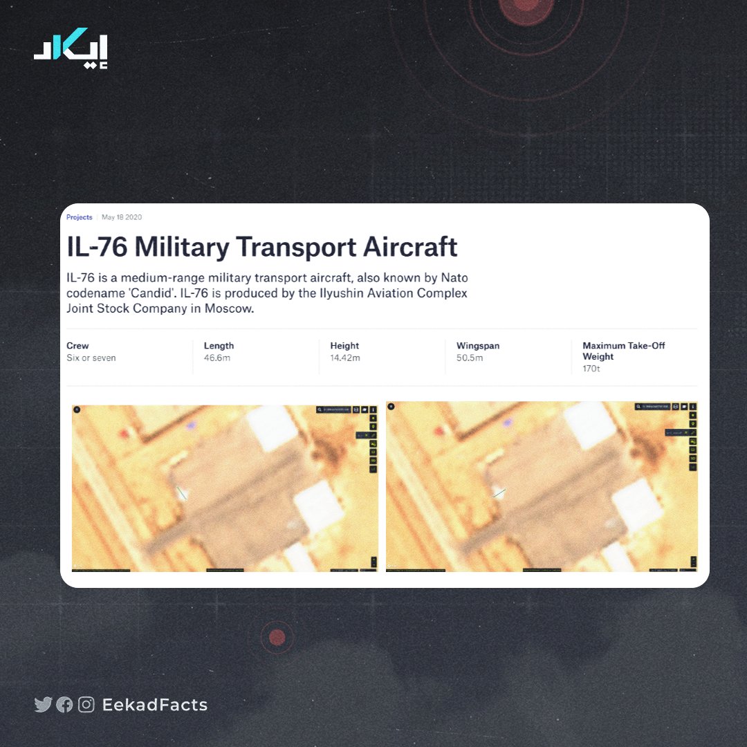 🔻 فريق إيكاد تأكد أن الطائرة الظاهرة في صور الأقمار الصناعية للقواعد الليبية هي من طراز إليوشن 76، عبر قياس أبعادها مع أبعاد إليوشن 76، التي يصل طولها إلى حوالي 47 مترًا وعرض جناحيها قرابة 50 مترًا.