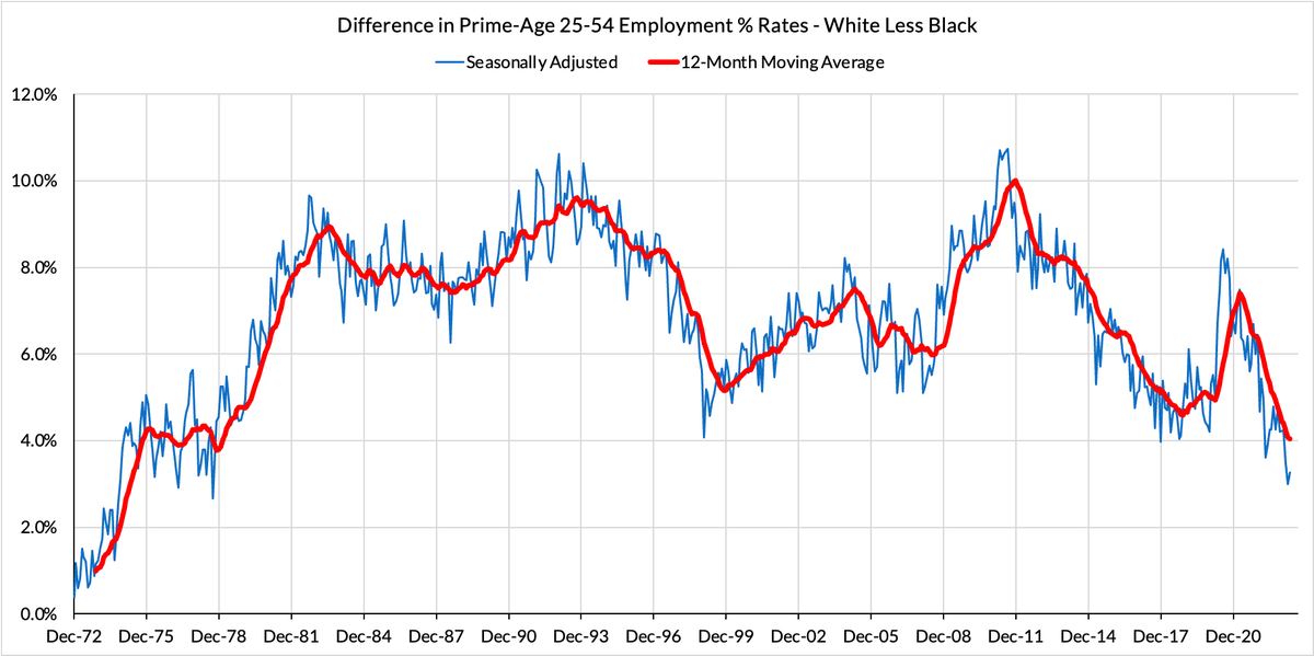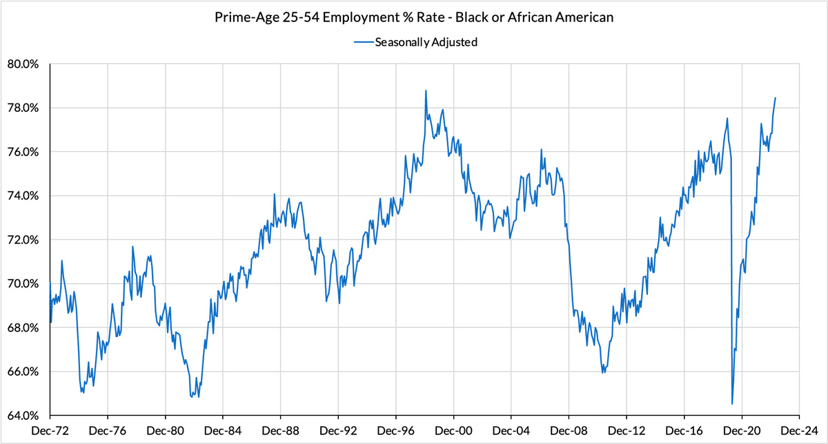 The prime-age employment rate among black and African American persons has been rocketing up, another 0.3% gain from March to April.