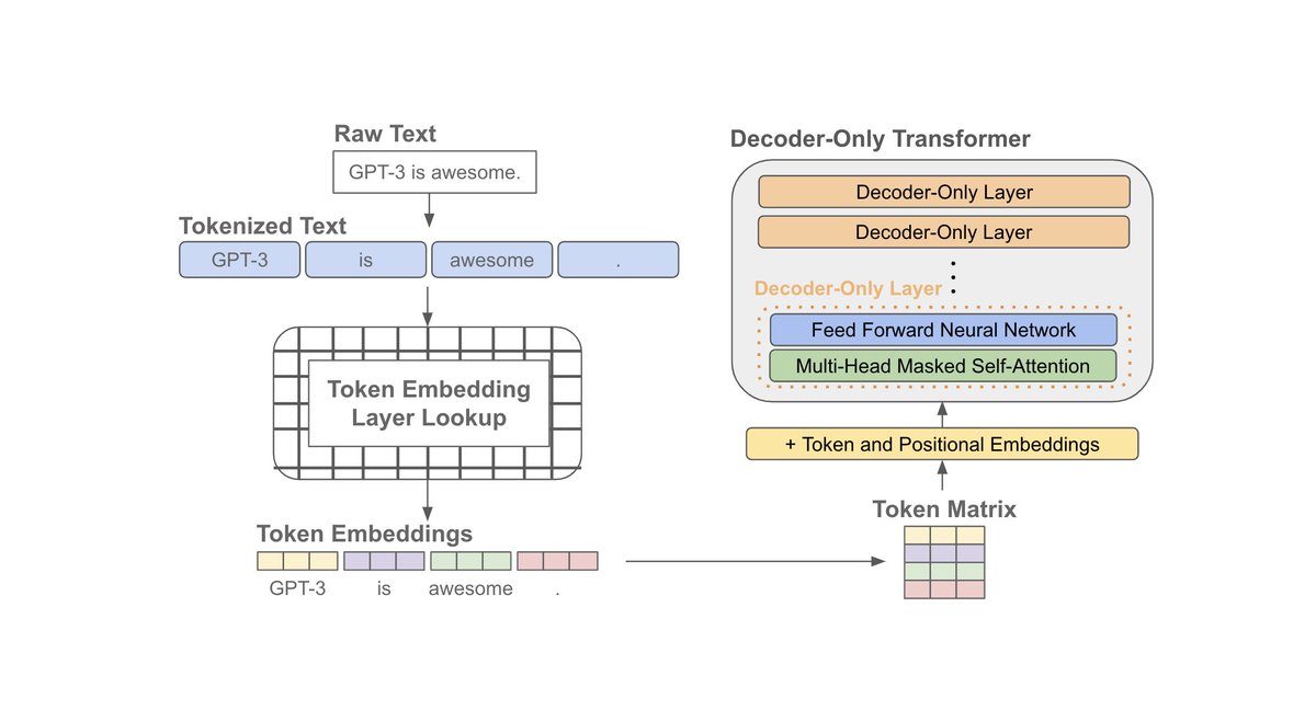 Decoder-only transformers are used by (large) language models. Why? Because their use of masked self-attention makes them highly compatible with next-token prediction. Each token only pays attention to prior tokens in the sequence! [3/7]