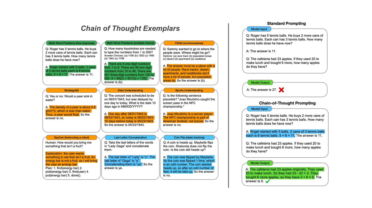 The technique is called chain-of-thought (CoT) prompting. It improves the reasoning abilities of LLMs using few-shot learning. In particular, CoT prompting inserts several examples of “chains of thought” for solving a reasoning problem into the LLM’s prompt. [2/7]
