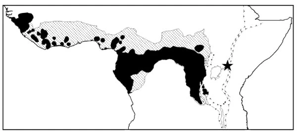 The solid black represents the current range where our closest living cousins the 2 Pan species are found. The * shows the site where the only known fossil chimp from ~545 KYA was found. Here it overlapped in space & time with an extinct grade of Homo, probably erectus. Thus,