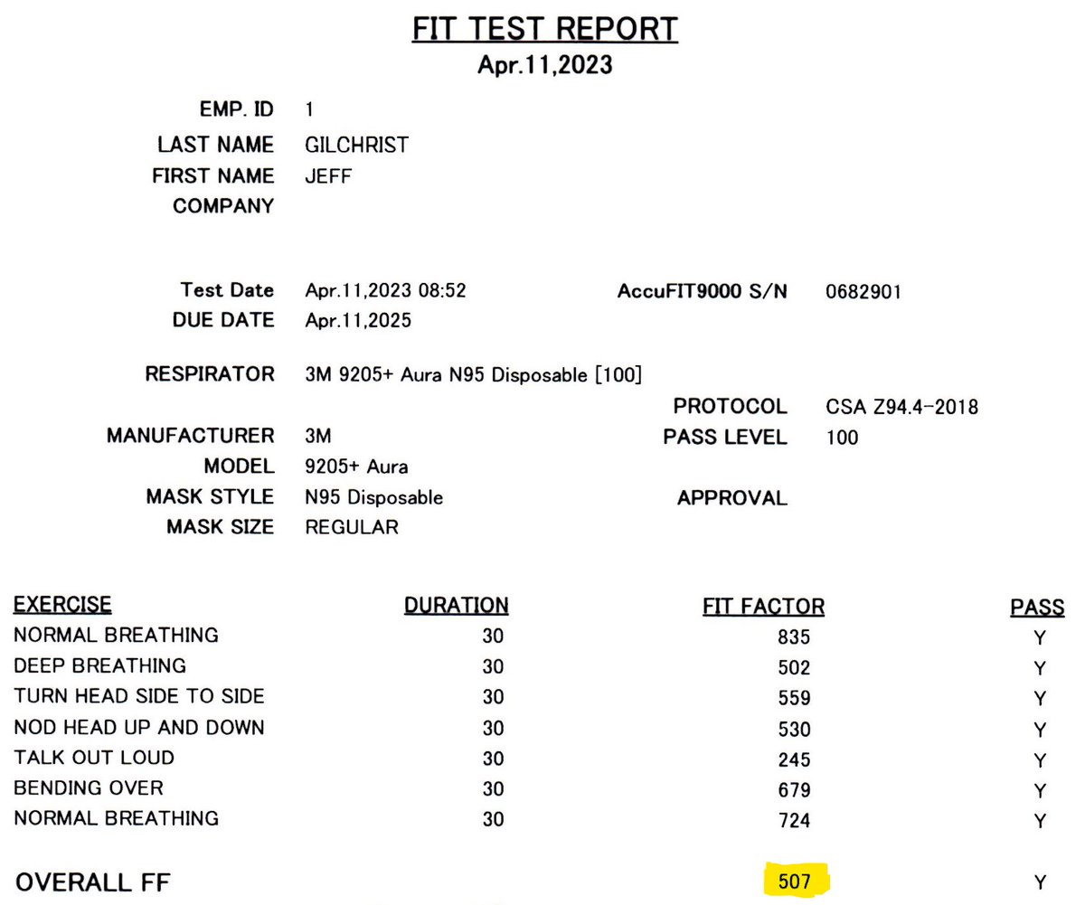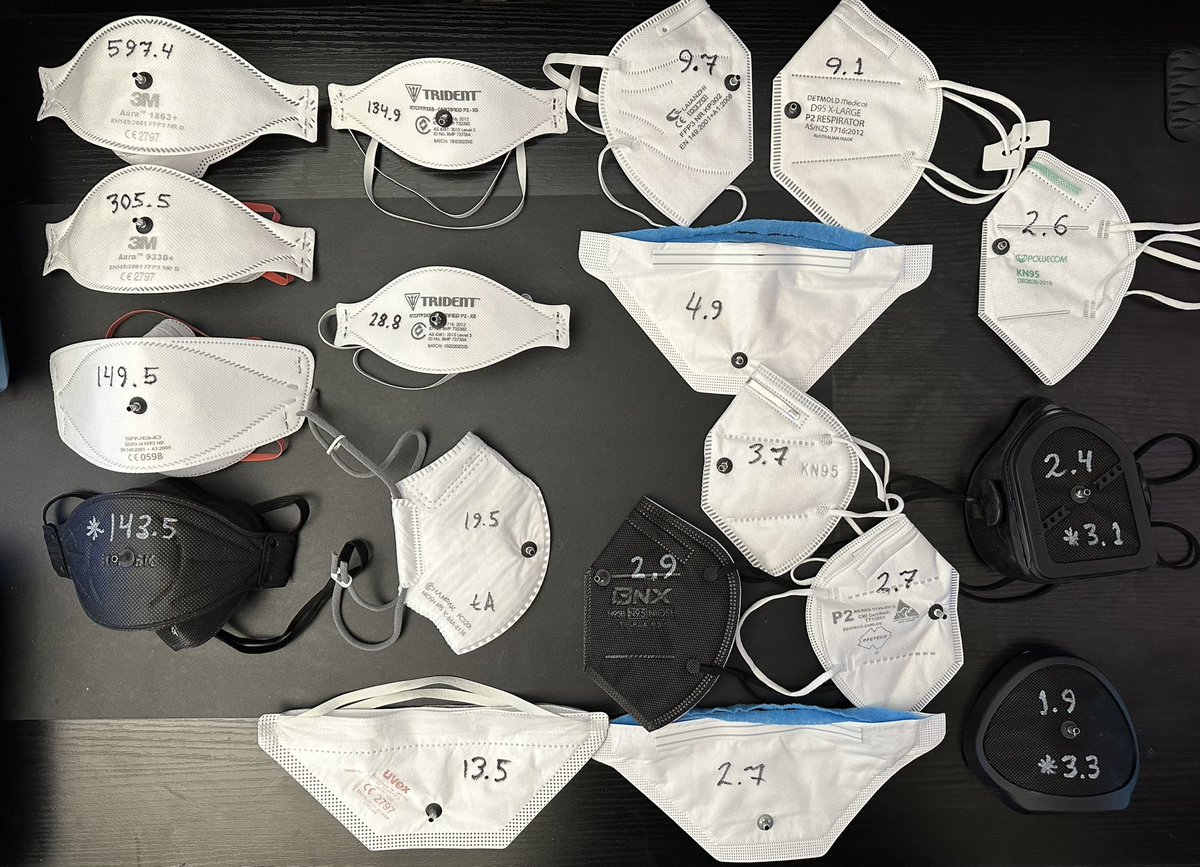 This thread explains what mask fit testing is (qualitative and quantitative), why it is important, and my testing experience with some real-world results of various types of masks including NIOSH N95 and ear loop. 🧵1/