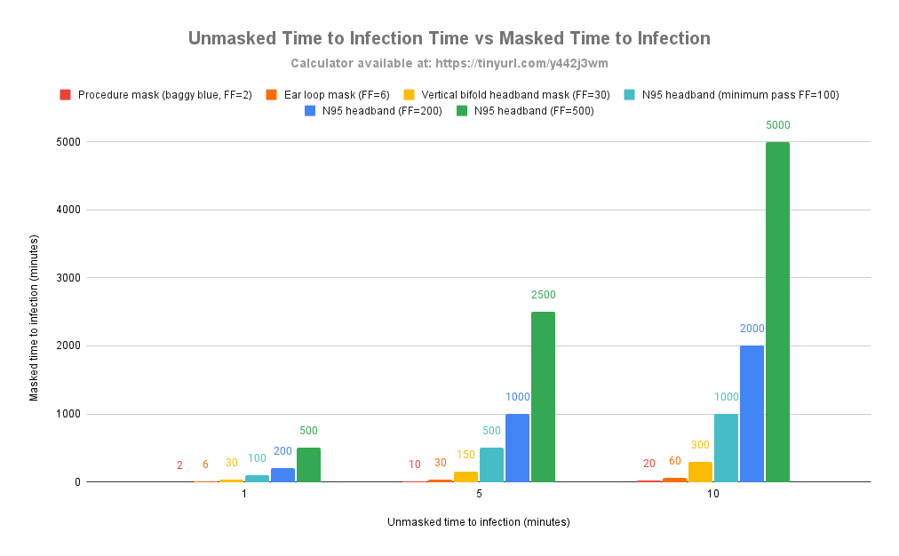 Upgrading to an ear loop mask with FF=6 extends infection time to 6 minutes, while a respirator that has the minimum FF score of 100 would give you 100 minutes (1.6 hours) before infection in the same scenario. 36/