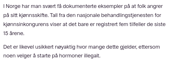 3/Tallene @Helsedirat viser til (fem på 15 år), gjelder bare dem som har gått gjennom hele prosessen hos den nasjonale behandlingstjenesten (Riksen), dvs fjernet stellet osv, og deretter angret. Tallene omfatter ikke de som har sluttet underveis (hos Riksen),