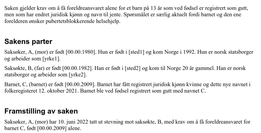 2/ Dommen 25. november 2022 gir utenverdenen et sjeldent innblikk i behandlingen av søknader om å endre juridisk kjønn og vurderingene som gjøres før oppstart av pubertetsblokkerende helsehjelp til barn under 16 år.
