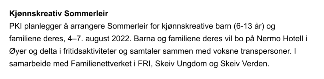 27/ I 2023 mottok Pasientorganisasjonen for Kjønnsinkongruens (PKI) for første gang driftstilskudd fra staten (3 600 000 kr). @bufdir@Trettebergstuen Pr. 31.12.2021 hadde PKI 828 medlemmer. Økning på 400 fra 2020. I fjor arrangerte de sommerleir for kjønnskreative barn 6-13 år.