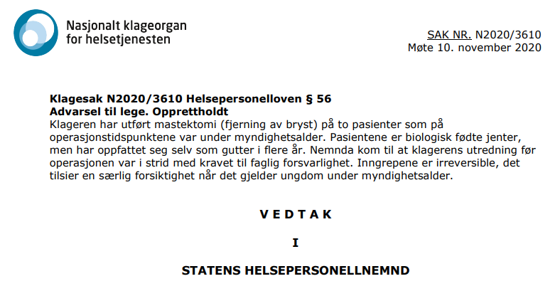 Simensen hadde utført mastektomi (fjerning av bryst) på to jenter under 18 år, som «oppfattet seg selv som gutter i flere år».