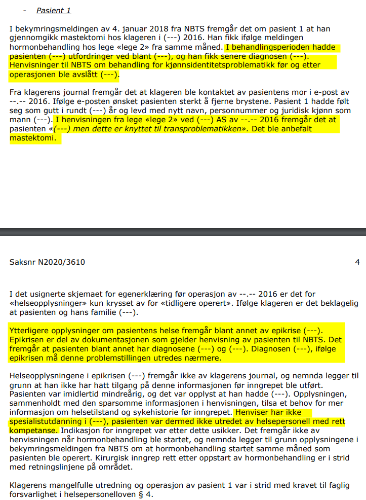 4/ Pasient 1. Samme måned som lege «lege 2» (anonymisert i vedtaket) satte pasienten på hormonbehandling, henviste han pasienten til Simensen for mastektomi. Lege «lege 2» hadde ikke spesialistutdanning, og derfor ikke rett kompetanse.
