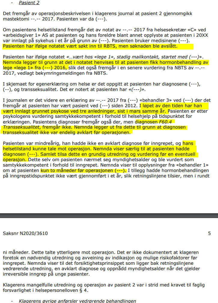 5/ Likevel, og til tross for at det fremgikk av epikrisen at pasienten måtte «utredes nærmere» ifm. andre diagnoser, fremholdt lege «lege 2» at «dette er knyttet til transproblematikken», og anbefalte mastektomi. Henvisninger til NBTS ble før og etter operasjonen ble avslått.