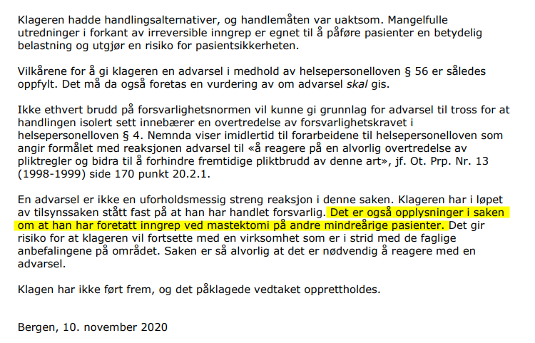 11/ I 2008 ga Helestilsynet Benestad advarsel. Benestad «hadde henvist tre pasienter til operativ fjerning av brystene uten en bredt anlagt tverrfaglig vurdering før henvisning.» Jf. Nemndas vedtak HPN-2008-157.