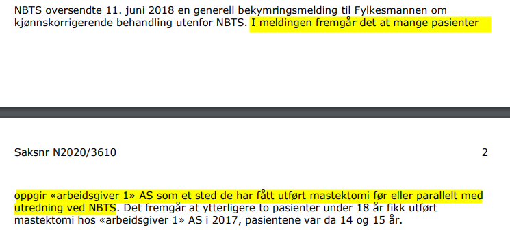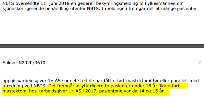 29/ I alle tilfellene, som her er omtalt, hvor *kirurgi* er utført på mindreårige, har foreldrene samtykket. Etter at Simensen fikk advarsel fra Tilsynet, sender foreldre sine mindreårige barn til utlandet for mastektomi (se innslag med Simensen).