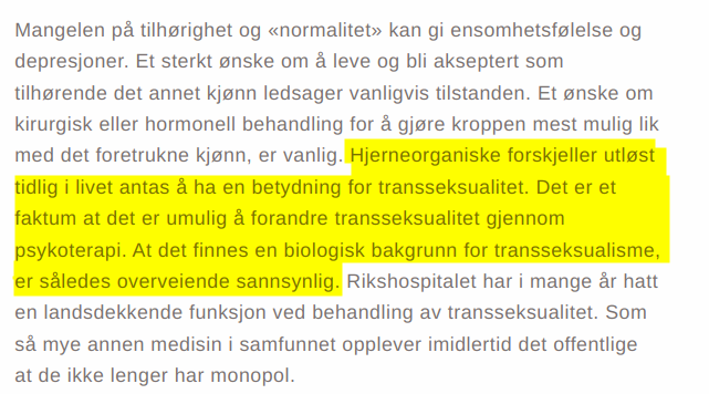 15/ Simensen går langt i å hevde at kirurgi er eneste løsning. At transseksualitet skyldes «[h]jerneorganiske forskjeller utløst tidlig i livet», og at det er «umulig å forandre transseksualitet gjennom psykoterapi».