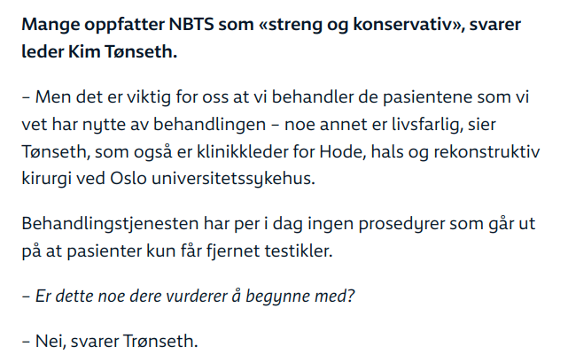 24/ Fjerning av testikler var også en ordning som Benestad foreslo i et oppslag på nrk.no i 2019 («ikke alle ønsker seg en vagina»). Pasientorganisasjonen for Kjønnsinkongruens (PKI) var positive til forslaget. nrk.no/sorlandet/kjen…