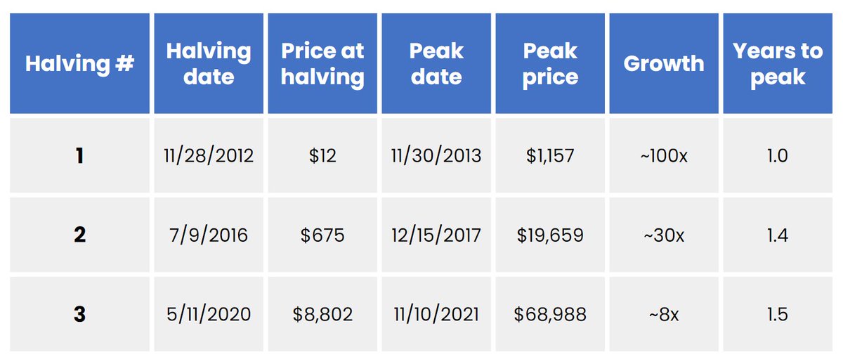 Bitcoin has had 3 halvings in its 14-year existence. In 11.5 months, the next halving will arrive.