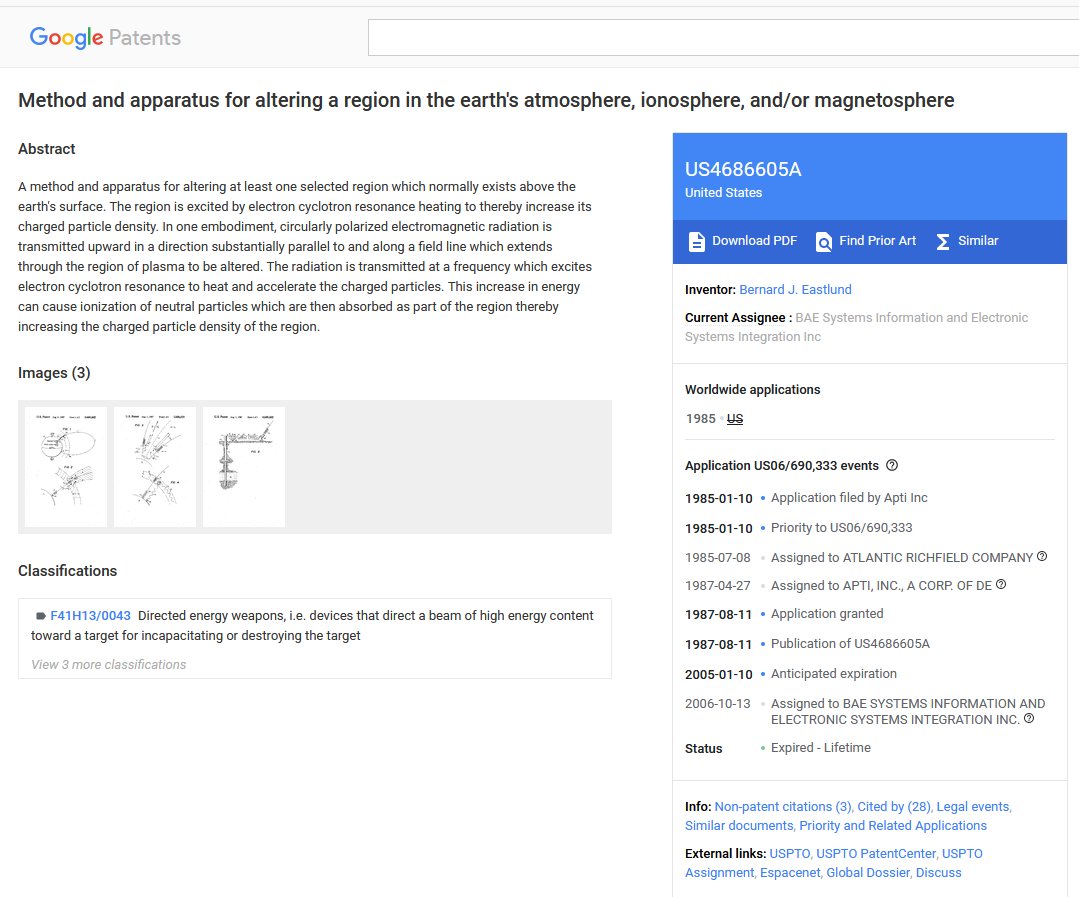 La patente se titula "Método y aparato para alterar una región en la atmósfera terrestre, ionosfera y/o magnetosfera".