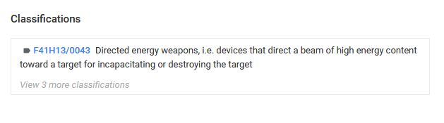 El invento está clasificado en el grupo F41H13/0043, que es el de "Armas de energía dirigida, es decir, dispositivos que dirigen un haz de alto contenido de energía hacia un objetivo para incapacitarlo o destruirlo"