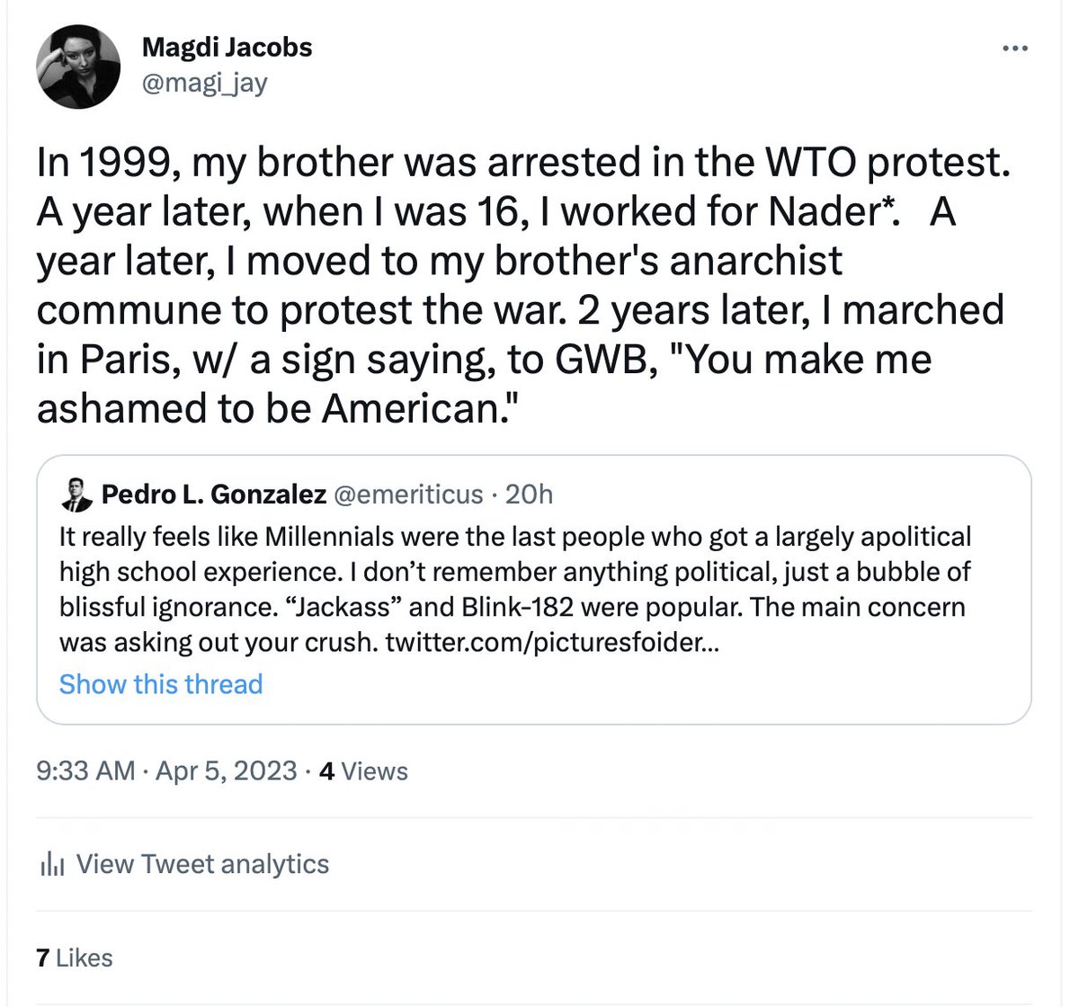 In 1999, my brother was arrested in the WTO protest. A year later, when I was 16, I worked for Nader*. A year later, I moved to my brother's anarchist commune to protest the war. 2 years later, I marched in Paris, w/ a sign saying, to GWB, "You make me ashamed to be American."