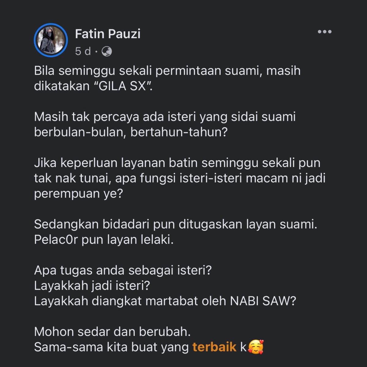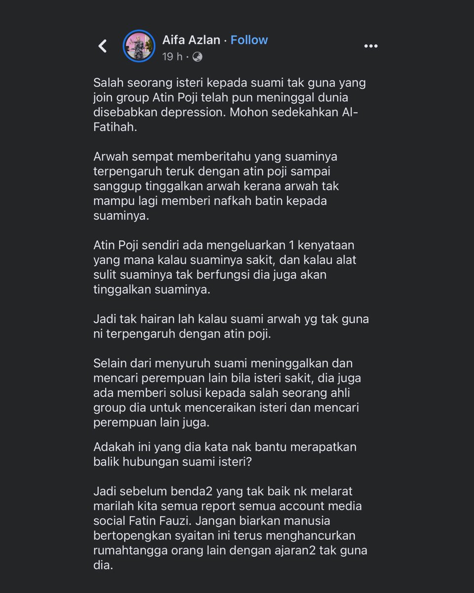 5. Seorang pengguna Facebook berkongsi peristiwa di mana seorang suami sanggup meninggalkan isterinya yang sedang sakit kerana pasangannya itu tidak lagi mampu memuaskan kehendak batinnya, seperti yang disarankan oleh Ustazah Fatin.