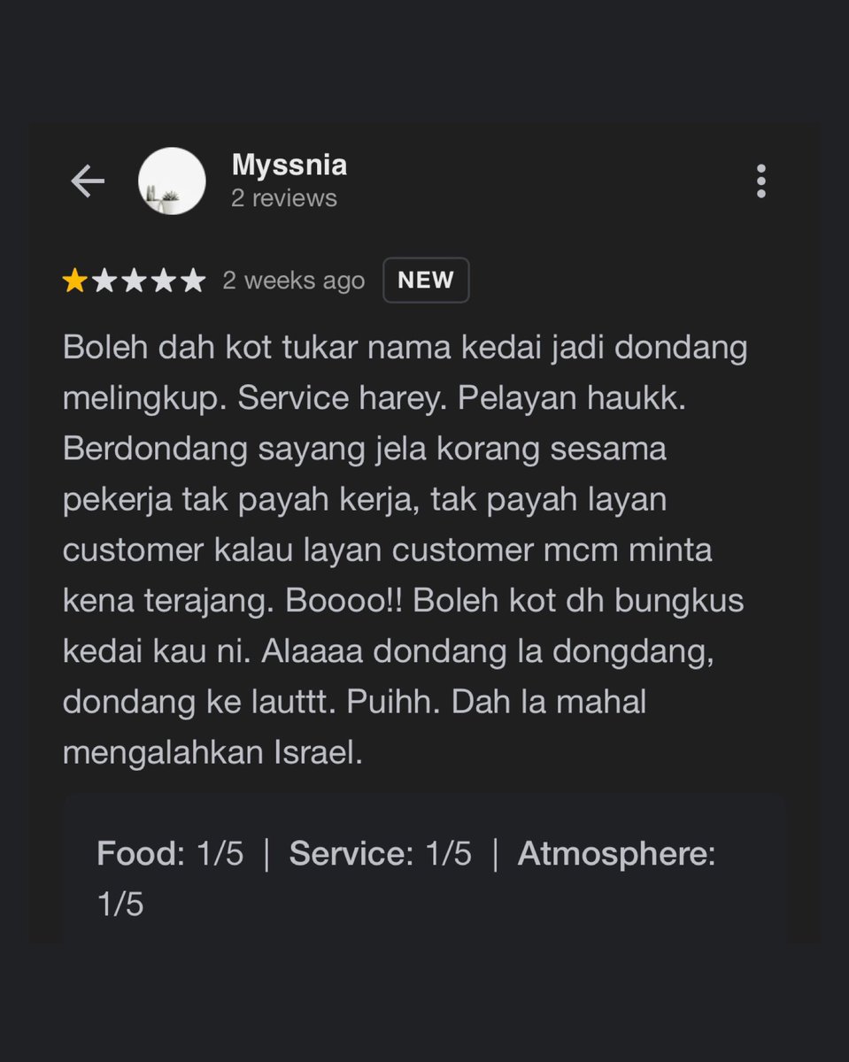 2. Difahamkan, ramai pelanggan memberikan satu bintang kerana tidak berpuas hati dengan layanan kurang mesra para pekerja selain kualiti makanan serta harga yang mereka sifatkan ‘mengalahkan Israel’.