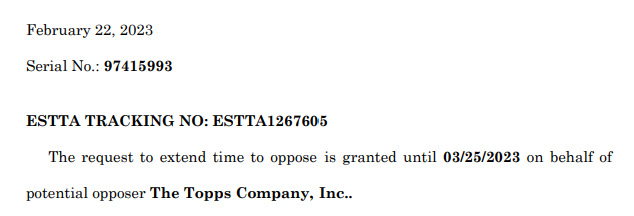 At this time, Topps does not have to identify the mark(s) it is concerned about; it only needs to do that once/if an opposition is filed. And if that happens, it'll be March 25, 2023.
