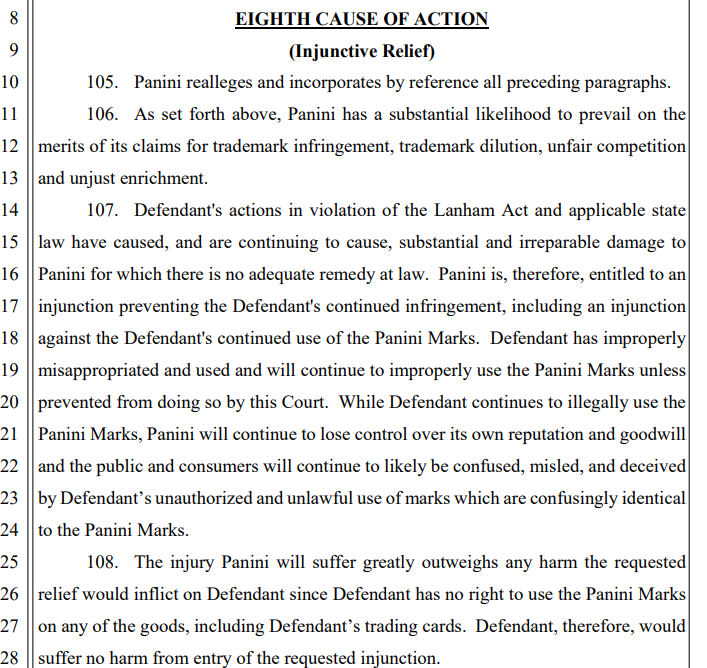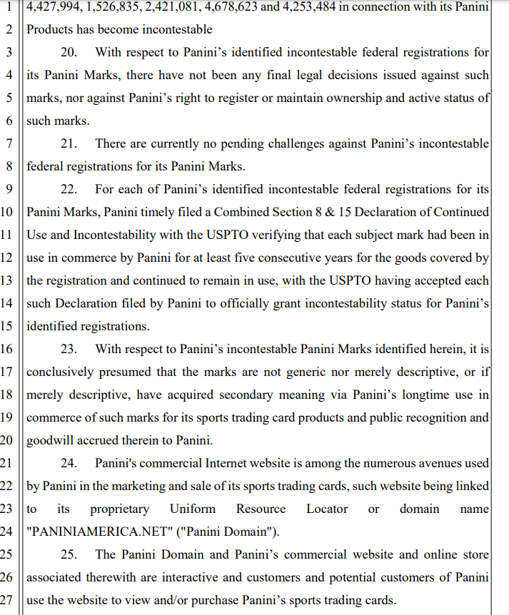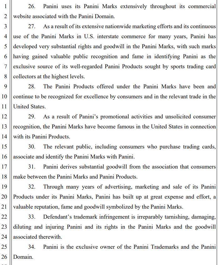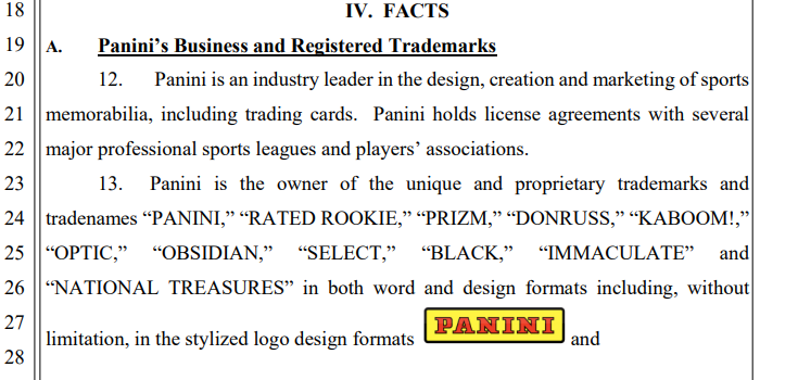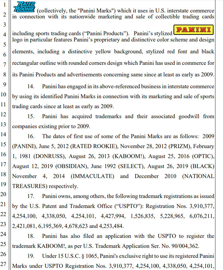 Diving into the new complaint, it starts off similar to the last complaint by going through Panini's IP including the RATED ROOKIE and PANINI logos...