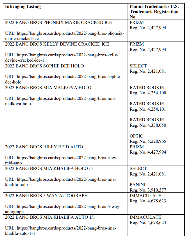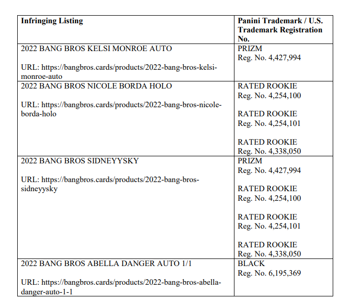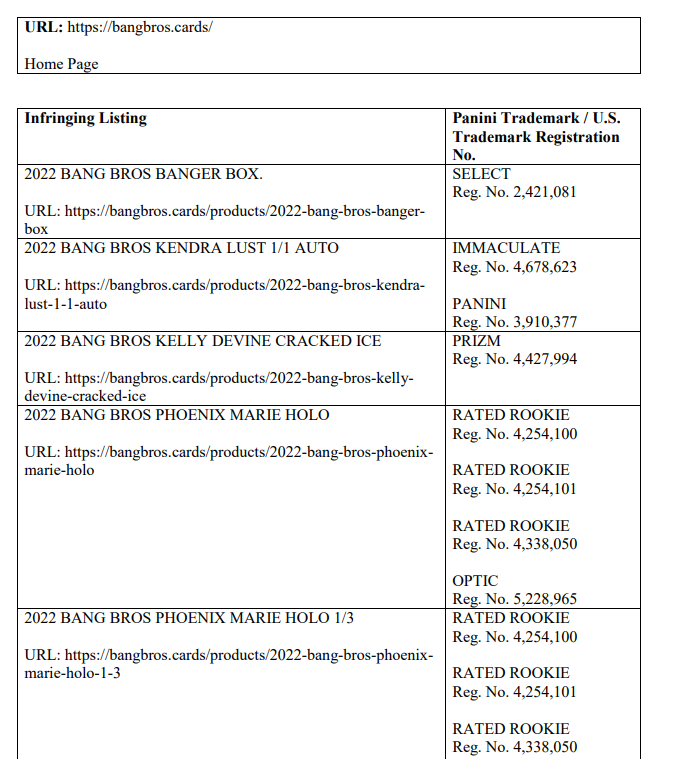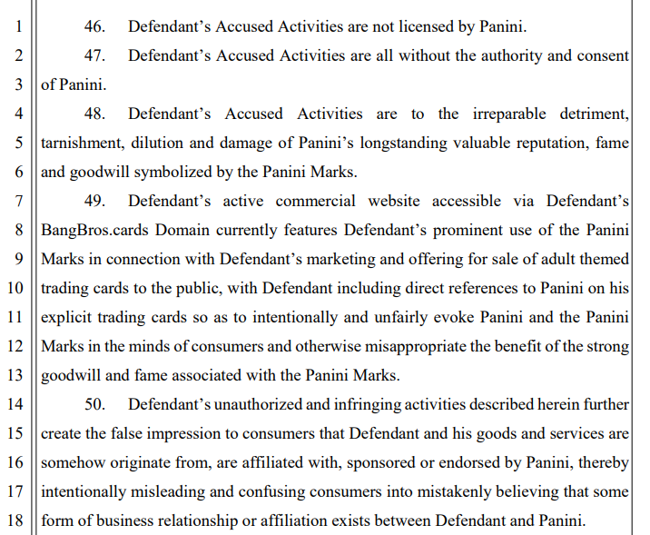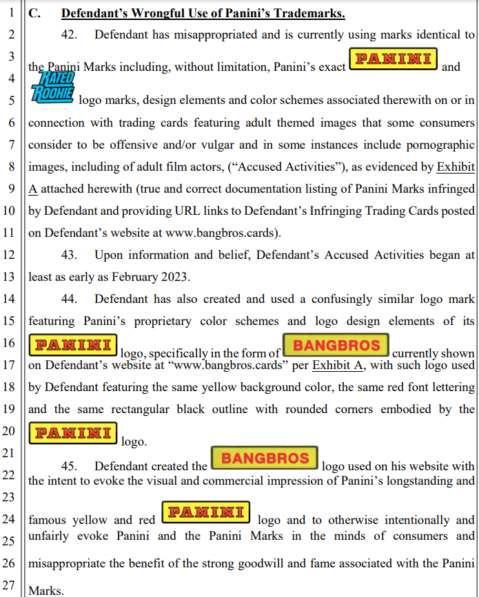 Next up, the complaint runs through "Defendant's Wrongful Use of Panini's Trademarks" and this is really a re-hash of the last complaint, pointing out that Bang Bros dot Cards infringed the RATED ROOKIE and PANINI trademarks...among others.