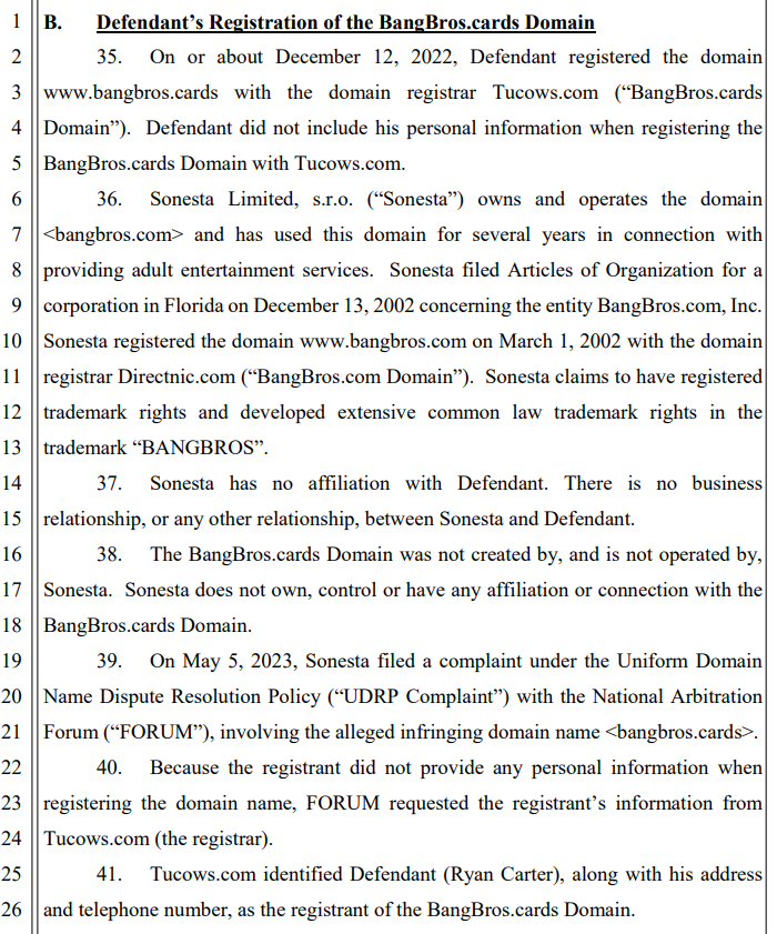 First up: On May 5, Sonesta (a/k/a the actual BangBros...who Panini originally sued) filed a complaint to cancel BangBros dot Cards domain...and when it did that, the registrar ID'd Ryan Carter as the registrant.