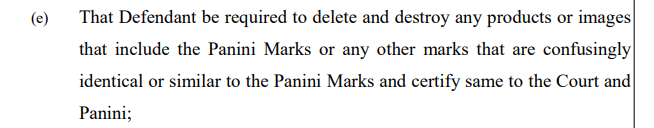 Panini also seeks an injunction to shut down Bang Bros dot Cards as well as to "destroy any products or images that include the Panini Marks or any other marks that are confusingly identical or similar to the Panini Marks."